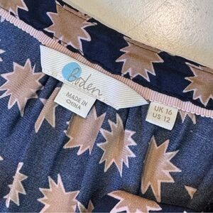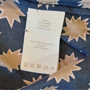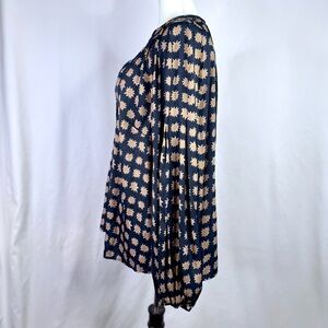 Boden silky blouse navy tan v-neck buttons balloon sleeves elastic cuff 12