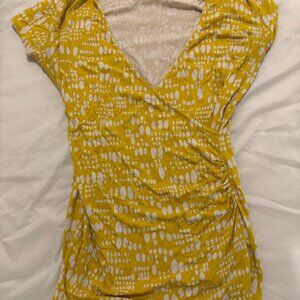 Boden size 4 yellow and white short sleeve faux wrap polka dot top, stretchy, fun for work and for drinks after!