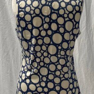 Stylish women's top featuring a navy and cream polka dot design. Perfect for casual outings or a chic office look.