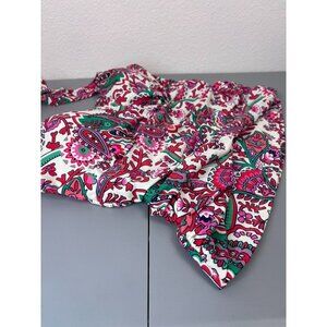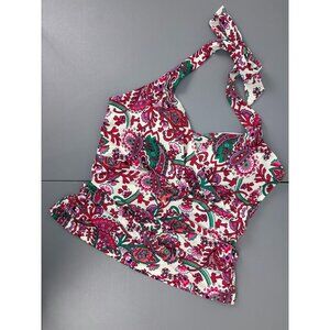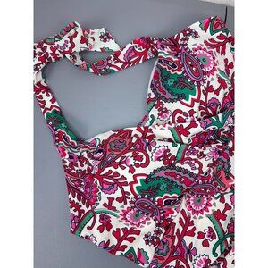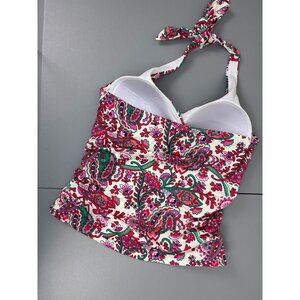 Boden brand women's size 16-18 red levanzo halter tankini top. In like new condition, little to no sign of wear. Beautiful patterned top with a wrap style bodice and halter neck tie. Sides are ruched for a slimming effect. Has a built in lightly lined cup wireless shelf bra.