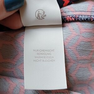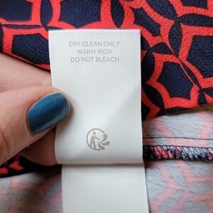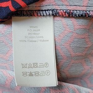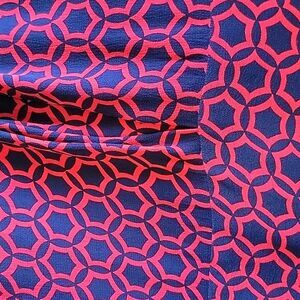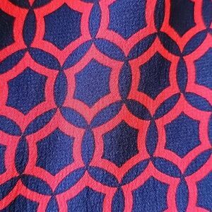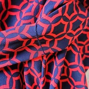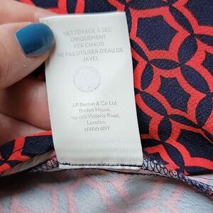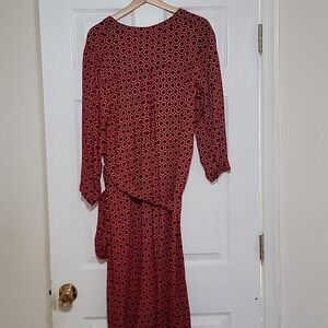 good condition Boden women's maxi dress in a geometric medallion navy and red pattern. 100% viscose. Sleeves, v-neck, belt included. One thread belt loop is missing on one side. No stains, no holes.