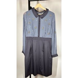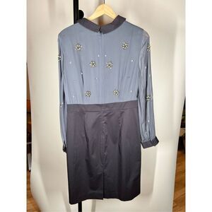 Back zipper, hook and eye on back of collar, pleats on front and back of waist. Button cuffs. Sheer top with matte navy collar and skirt. Lined.