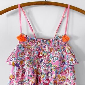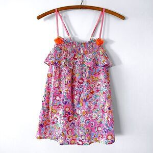 Bright floral print with a ruffle chest and cute pom pom accents. Has adjustable cross back shoulder straps. New with tags
