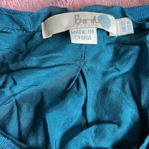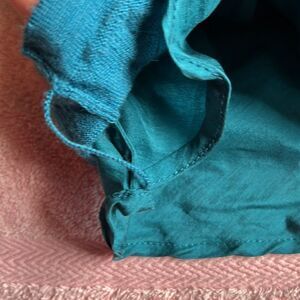 It’s like this shirt ran full force into beads and confetti. Large ‘sequins’, beads and rhinestones sewn onto the front AND BACK of this short sleeved top. Top is fully silk lined and the outer shell is a soft wool. Fits about a Medium. Color is definitely a teal.