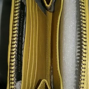 Color: Sunshine with geometric pattern. Iphone zip wallet. Credit card slots and open pocket. Closure: zipper. Height: 5" Width: 6" Depth: 1". Leather trim w/fabric. Lined.