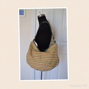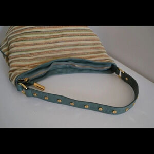 Bodhi striped straw hobo with gold toned hardware. Leather trim. Green, beige, gold color. Measures 15" x 10" shoulder drop 16". Zip closure. Gold toned studs on bag handle. In excellent condition! No flaws.