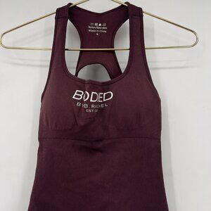 Bodied by B. Rachel seamless ribbed romper in deep burgundy. Size L. Stretchy nylon/spandex blend with racerback and logo detail. Flattering fit for workouts or casual wear.
