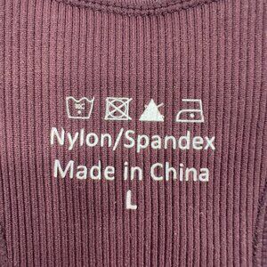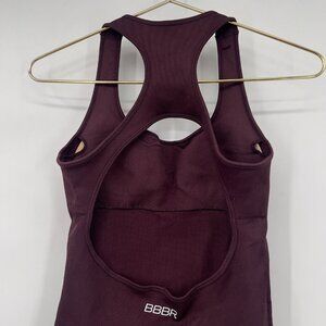 Bodied by B. Rachel seamless ribbed romper in deep burgundy. Size L. Stretchy nylon/spandex blend with racerback and logo detail. Flattering fit for workouts or casual wear.