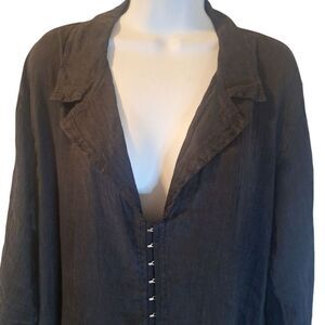 Very nice black linen, silk blend tunic open V neck collar with silver hook&eye closure 80% linen 20% silk crinkled with a lovely sheen generous size M measures flat 23" pit to pit 35" long would fit L to XL lagenlook , fun artsy piece!