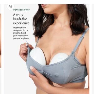 The most comfortable nursing and pumping bra! Size M, pack of 2. Hands free pumping, holes for flanges or insert portable pumps. Clips for easy nursing. The material is silky and soft on sore areas for the tough days and nights. ❤️ Stretchy with adjustable straps for a perfect fit. Grey blue color.