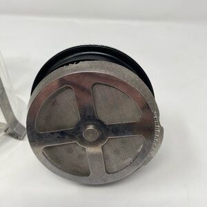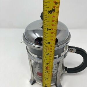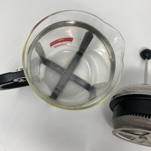 Sturdy, chrome-plated steel frame; black plastic lid and handle; easy-to-clean glass carafe
