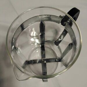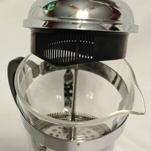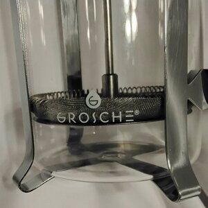 Bodum French press coffee maker with a compatible Grosche durable borosilicate replacement glass carafe. Features 8cup/1L capacity, chrome frame, and stainless plunger. Excellent condition and ready to brew.