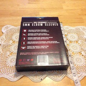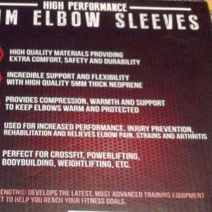New in opened box, one pair of 5MM high performance elbow sleeves from IronBull Strength. Provides compression, warmth and support to keep elbows warm and protected, for increased performance, injury prevention, rehabilitation, elbow pain, arthritis, strains. Iron Bull.