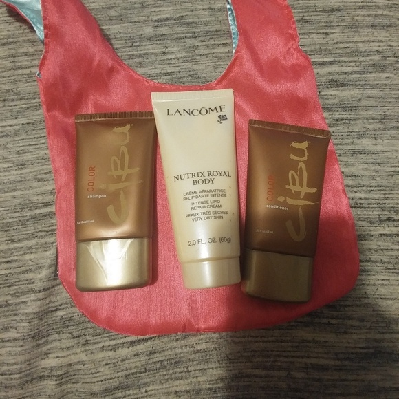This is a bundle with new products including travel size Nutrix Royal body cream, and cibu shampoo and conditioner with bag.
