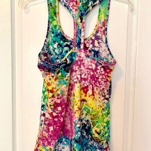 Eye-catching tank top with a vibrant abstract design. Features a blend of red, pink, blue, green, and yellow hues. Double lined with built in shelf bra. Racerback! Excellent Condition ๐๐๐๐โฅ๏ธ๐ช๐งโโ๏ธ