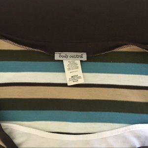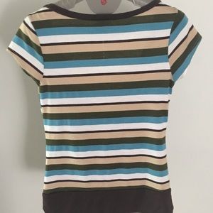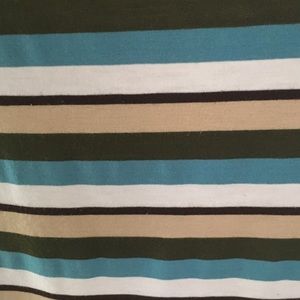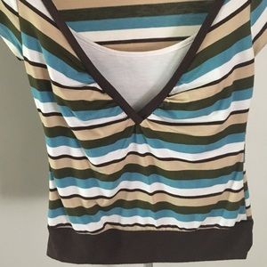 Embrace fun and fabulous style. You'll love the white brown green beige stripes. 95% Acrylic 5% Lycra fabric. V-Neck. Has white spaghetti strap insert that is attached to shirt. Made In U.S.A. Size Small. STYLE # 7T409B. CUT# 930242TDY. Approximate measurements, item laid flat: chest 15.5", length 22 (top to bottom hem)". Thanks for looking!