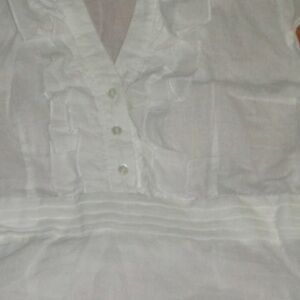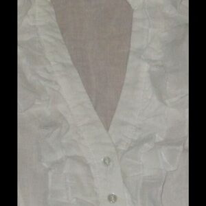 Elegant white blouse with ruffled front. Button-up design. Lightweight and stylish.