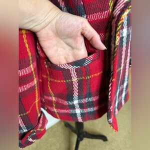 Body Central Y2K wool blend, Red plaid coat. Flap pockets in front. Breast pockets. Removable Hood. Button front.