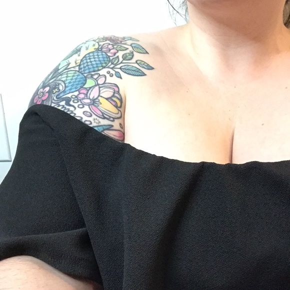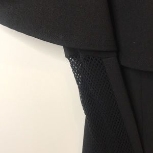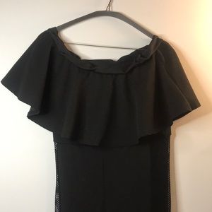 Only worn twice, body con catsuit with large off the shoulder ruffle and fishnet inserts from waist to ankle.