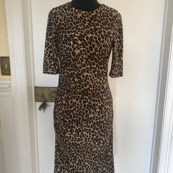 Vince Camuto body con 3/4 sleeve leopard dress with a side ruching detail to flatter your form better