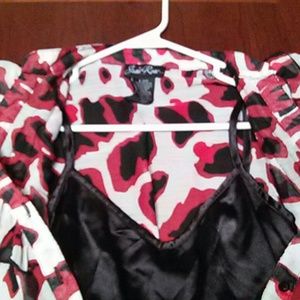 Red, black and white light weight form fitting dress. Comes with the black spaghetti strap underneath since the putter part is sheer.