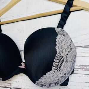 Body Flirt black bra with soft pink lace sides. Padded, underwire, adjustable straps. 2 hooks with 3 settings. Size 34DD like new.