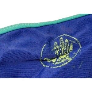 Lot of 3 Body Glove bikini pieces in bold colors and flattering cuts. First is cheeky blue bottoms with lime green and nude panel details, yellow trim, and logo on back. Second is a ruched-back tie side bottoms with bright blue body, white and mesh contrast panels, aqua piping, yellow string ties with silvertone rings, and soft ruffle edges. Third, is a matching triangle top with removable pads. All are front-lined with a good stretch. Great for surfing, swimming, or tanning. Mix-and-match the bottoms for sporty beach vibes or summertime poolside days.