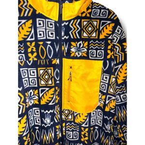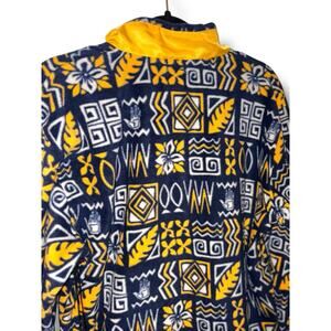 Body Glove men’s full-zip fleece jacket in navy blue and yellow with a bold geometric and tropical-inspired pattern. Features a contrast yellow nylon chest pocket and collar detail, soft fleece material, and zip closure. New with tags.