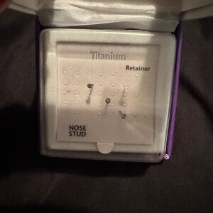 3 jeweled nose studs. They are titanium . One is silver, black and the third is multi colored like oil spill. All have a jewel. They are new in package never been used