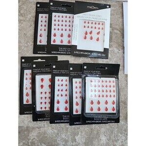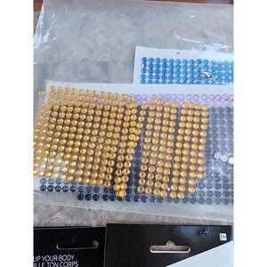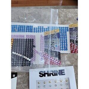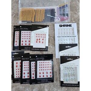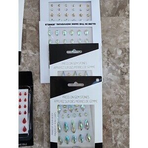 Assorted lot of body jewels. Several packages of red Tear Drop Jewels, Trips from Bling It!, packages from Shrine, and 2 iridescent press on jewels. Some opened and some new.