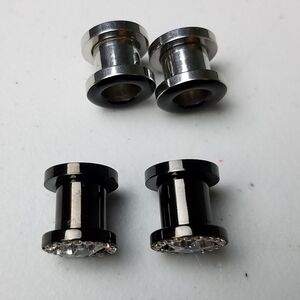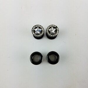 Body Rage 316L Stainless Steel Star CZ and black tunnel Plug Gauge bundle set. Black with star CZ and inset CZ accent, black and silver. Double flare screw on back. Size 0 G. Great pre-owned condition, one small stone missing from CZ set, please see photos for best description.