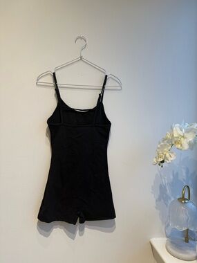 Body Snatching Ribbed Romper in Black. Tagged M but fits S / Small. Sleek black spaghetti strap romper with a fitted silhouette. The ribbed material makes it really flattering. Soft, stretch fabric for all-day comfort. Minimal design perfect for layering or wearing solo.