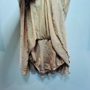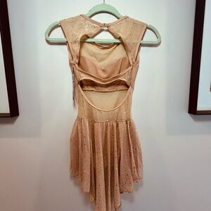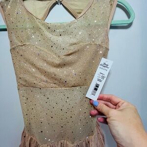 Elegant tan dance dress with sparkling details. Sleeveless design with a flowing skirt. Perfect for performances. Bandeau top appearance with loads of sparkles.