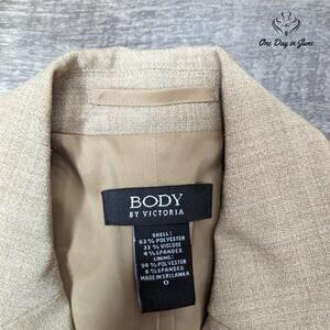 In a color as light as a pecan, sits this blazer from Body by Victoria, looking grand. Made of polyester, viscose, and spandex, it's like new, and will look dandy on you, in any land.