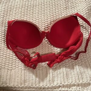 Bra is in great condition! It is a bright red color with lace cups, smooth straps and white details. It is a part of the Body by Victoria collection- lined with perfect coverage.