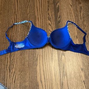 This is a fun blue bra with cheetah accents on the straps and tops of the cups.