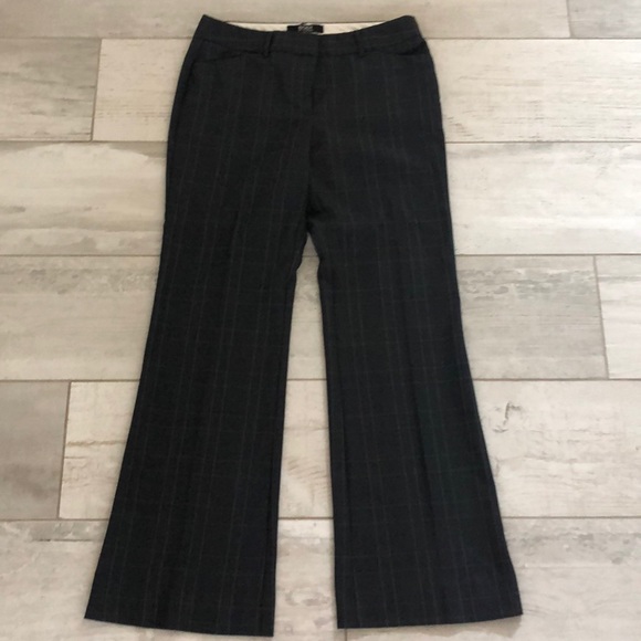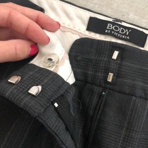 Body by Victoria dark charcoal grey with plaid pinstriping slack pants. The Christie Fit (relaxed fit, mid rise, wide leg) Professionally hemmed at 28 1/2”. Smoke free non-shedding dog home. No signs of wear.