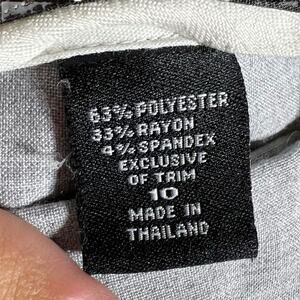 This pair of gray dress pants from Body by Victoria features the brand's signature "Christie Fit" design. Crafted with a blend of 53% rayon, 43% spandex, and exclusive trim, these slacks offer a comfortable, stretchy, and tailored look. The classic straight-leg silhouette and neutral gray color make them a versatile workwear staple that can be dressed up or down. The waistband is labeled as "Exclusive of Trim", indicating a premium construction. Size 10, made in Thailand.