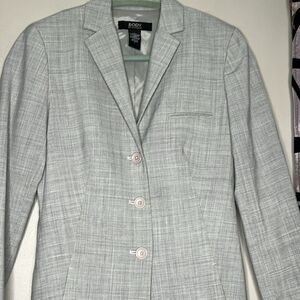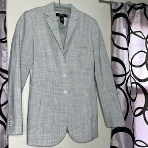 Gray and white blend with one pocket on the front, pocket is still sewn shut