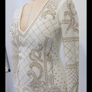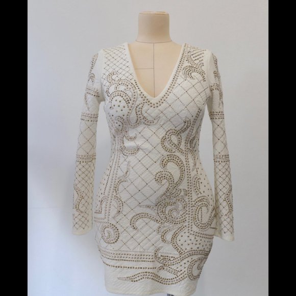 Authentic Bebe dress, with a moderate V neckline and made with a soft white fabric with a quilted design and gold stud all over. Fabric has moderate stretch.
