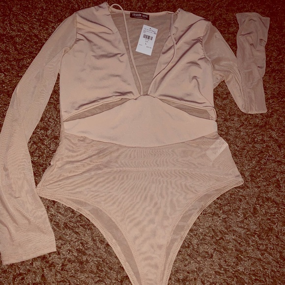 Super cute body suit from fashion nova , cut outs under boob area. I bought and could not return due to being bodysuit , tiny tear - see picture !