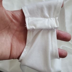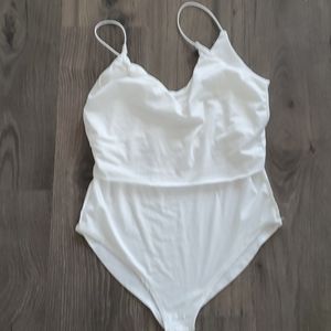 White snap on body suit with thin but sturdy straps. Super soft material. Built in 2nd layer around breast area from front to back in the inside. Never before worn. Received as gift but unfortunately not my style.