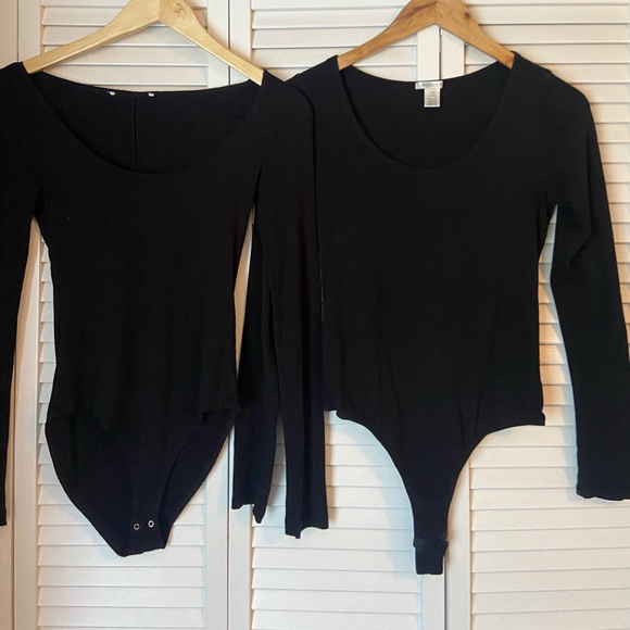 2 black long sleeved body suits one is ribbed material and the other smooth. Both in good condition no holes or pilling.