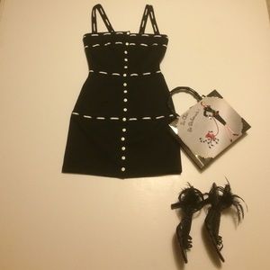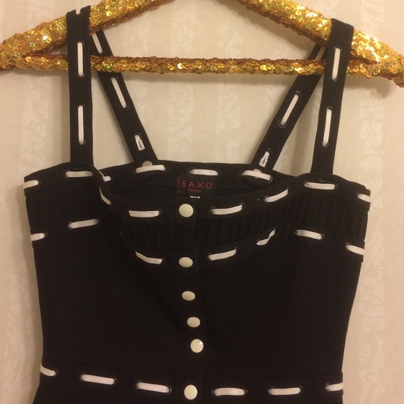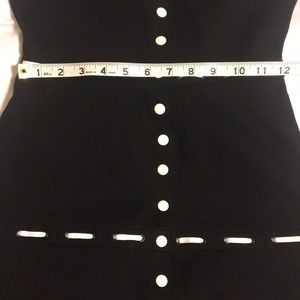This gently used dress is reminiscent of Herve Leger-form fitting and extremely supportive. There are functional creme coloured snaps that run down the front. Wear a sexy strapless bra and leave the top button unbuttoned! Creme shoelace-like threads go through metal eyelet holes throughout the entire dress. The bust measures 15 inches across, 12 inches at the waist, and 25 inches long when measuring the bodice area only, without the straps. Tag shows 38-French. Stretch is minimal.