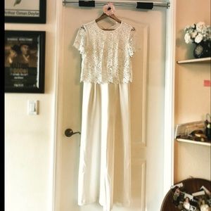BodyFlirt lace bodice jumpsuit. Funky and elegant, great party piece. Worn once at my rehearsal dinner. Long zip closure so very easy to slip into. Lace top hangs nicely at the waist (approx) and separately from the suit. Mother of pearl style button at the top for extra ladylike closure. 95% polyester 5% elastane. Some very slight pilling on the trousers part but unnoticeable when wearing.