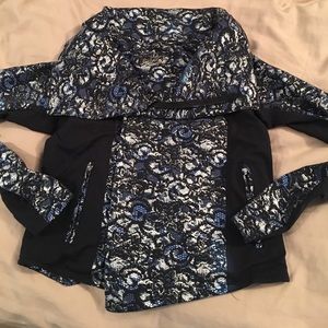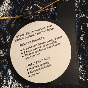 Size Medium. NWT. Uber chic “The Kate Jettsetter Jacket” in Electric blue lace and black. Zip off sleeves- can also be worn as a vest. Thumb holes for keeping warm while outside jogging or running errands in the fall weather. Looks amazing with black leggings and boots. Can also be worn to get you to/from the gym studio in style. Don’t miss out- this is the LAST ONE!