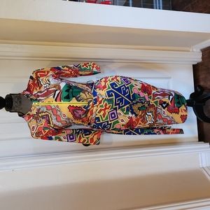 Wow! This dress looked so sexy. Unique, artsy, random designs, belt/belt loops, zips down in the front for more cleavage, spandex, stretchy, knee length, lots of compliments, worn once, kept in great condition, great for curvy and the voluptuous.