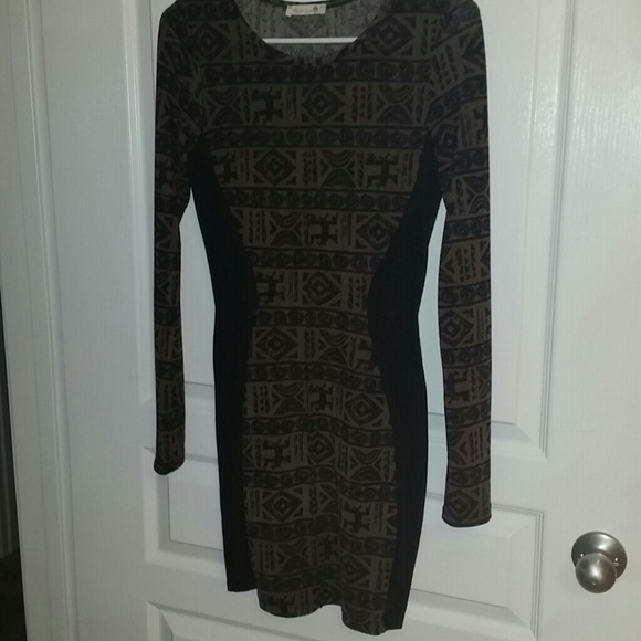 Long sleeve bodycon dress, black & tan tribal print. Woren Once