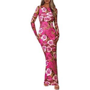 Bodycon Maxi Dress Long Sleeve Sexy Mesh Rose