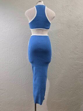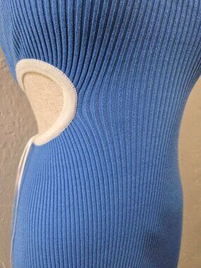 Minnie & Co. bodycon blue midi ribbed knit dress with sporty white contrast binding, side-to-back cutout.